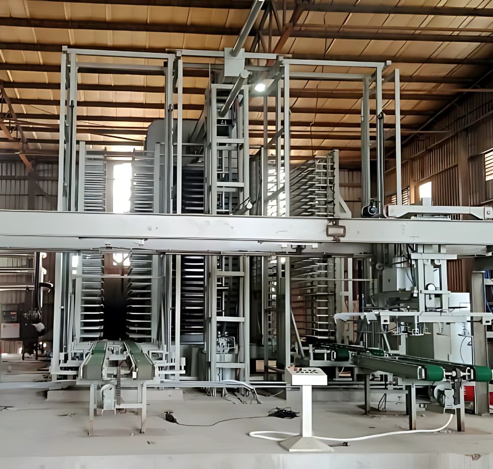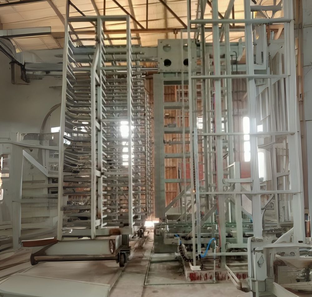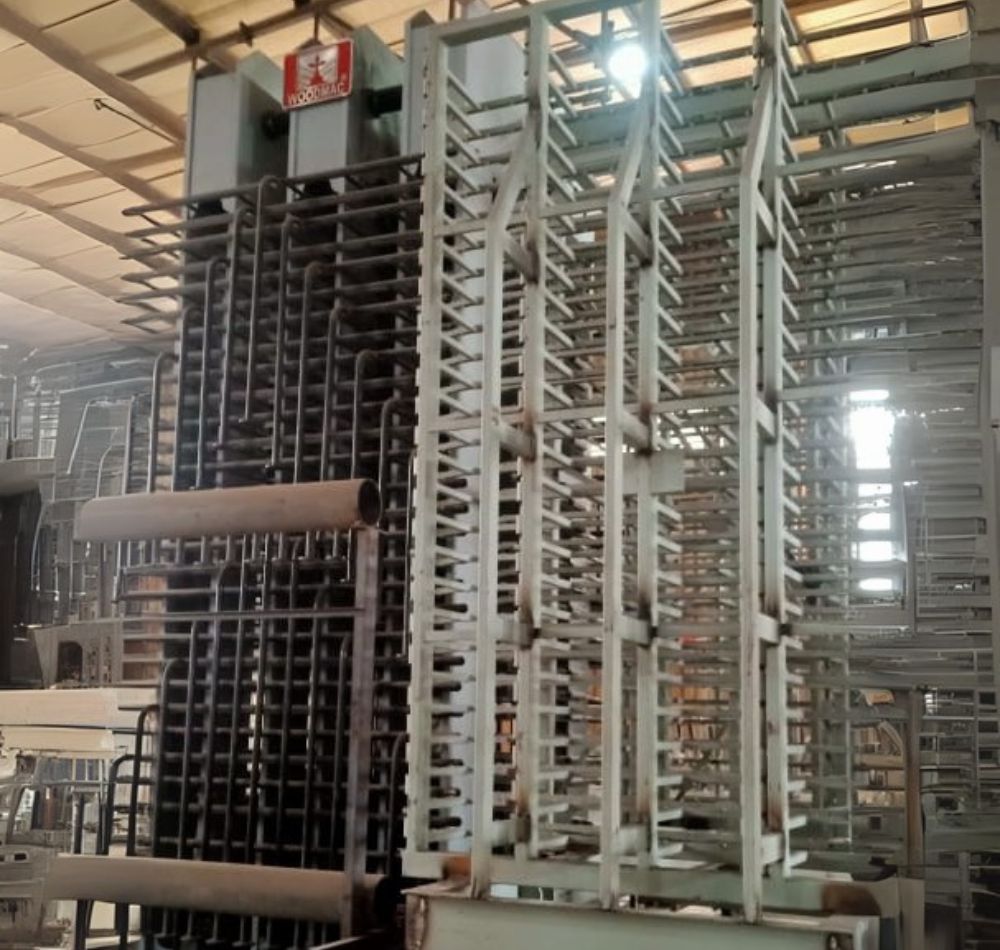 One For holding uncured forming stacks size 8' x 4’ of 25 shelves and One for holding cured Forming stacks.Each shelve furnished with slide-rolls for smooth movements of forming stacks to & fro. Each shelves provided with individual side guide rollers with bearing to minimize friction and enhance aligned Loading & Unloading. The cage-shelves matching with the geometry of press daylights. Both cages installed on Wheeled trolley with drive system moving on common tracks.